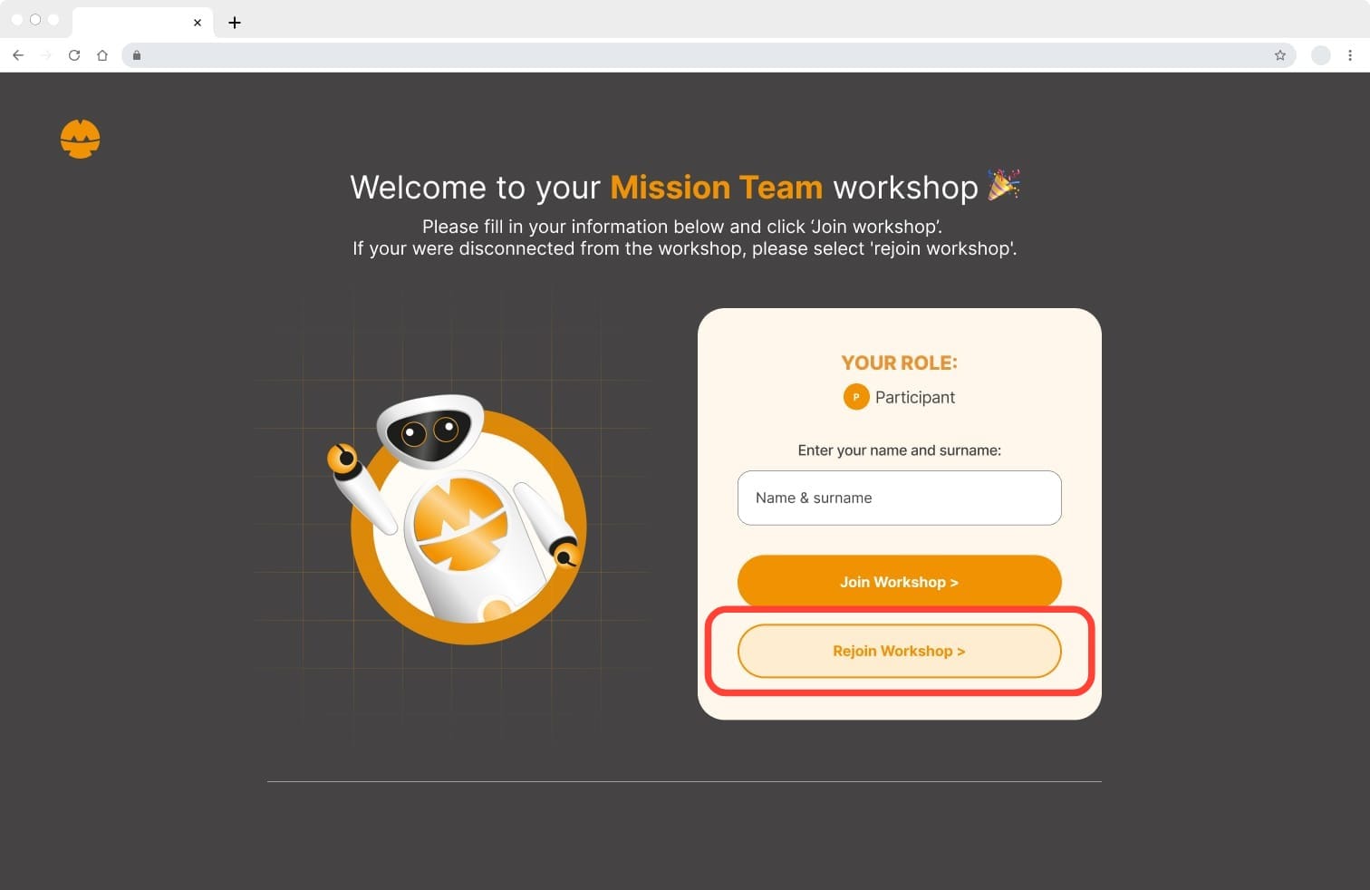 - Then, click the Rejoin Workshop button and follow the instructions. You will automatically be taken back to the point where you lost connection.