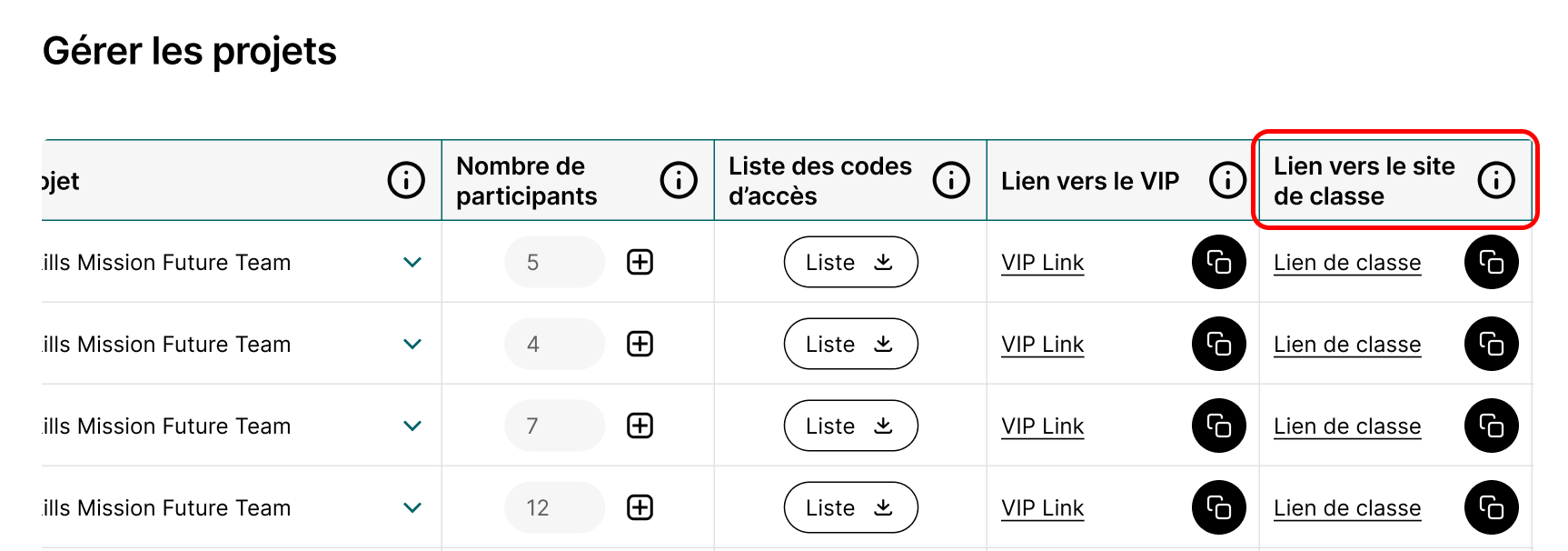- Sous l'onglet Gérer les projets créés, allez à la colonne Lien vers le site de classe et cliquez sur le lien correspondant (également disponible sur la Liste des codes d'accès).