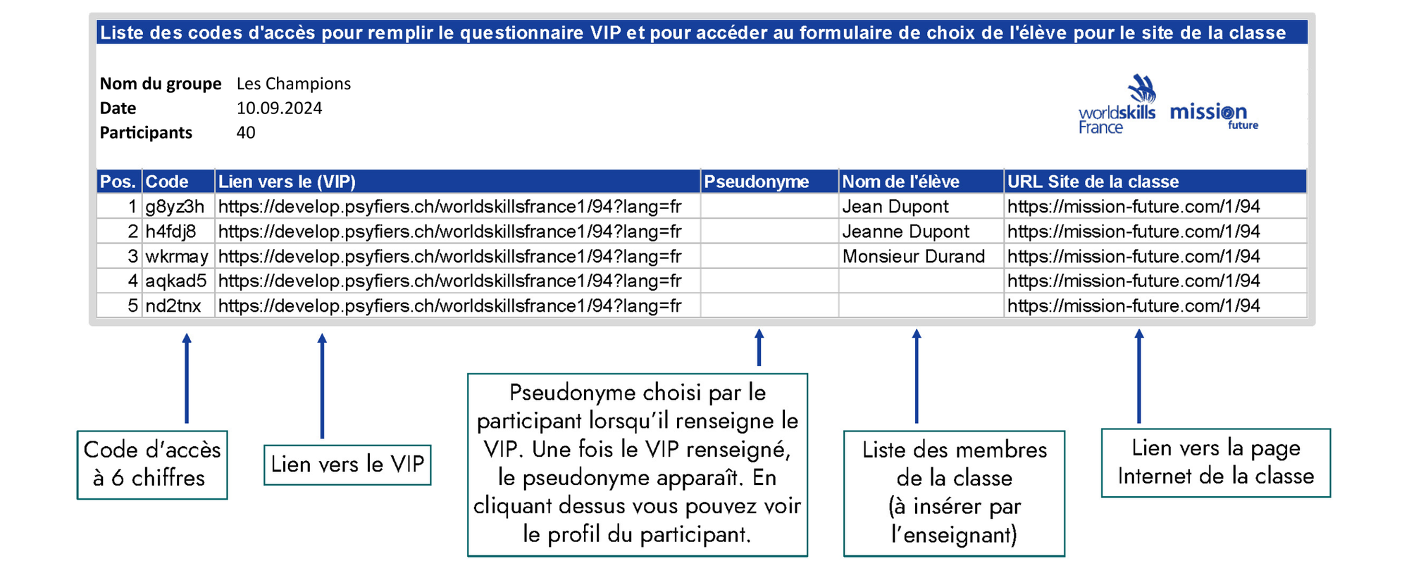 La Compétition WorldSkills Lyon 2024 débutant le 10 septembre, il reste peu de temps pour préparer une visite fructueuse avec vos élèves. En conséquence, nous vous mettons à disposition un logiciel qui permet de transférer les profils mission future des élèves d'une classe à l'autre. La visite de la Compétition peut ainsi être préparée en deux blocs, un avant les vacances d'été dans les classes établies à ce moment-là, puis un autre autour de la compétition, dans les classes recomposées à la rentrée.