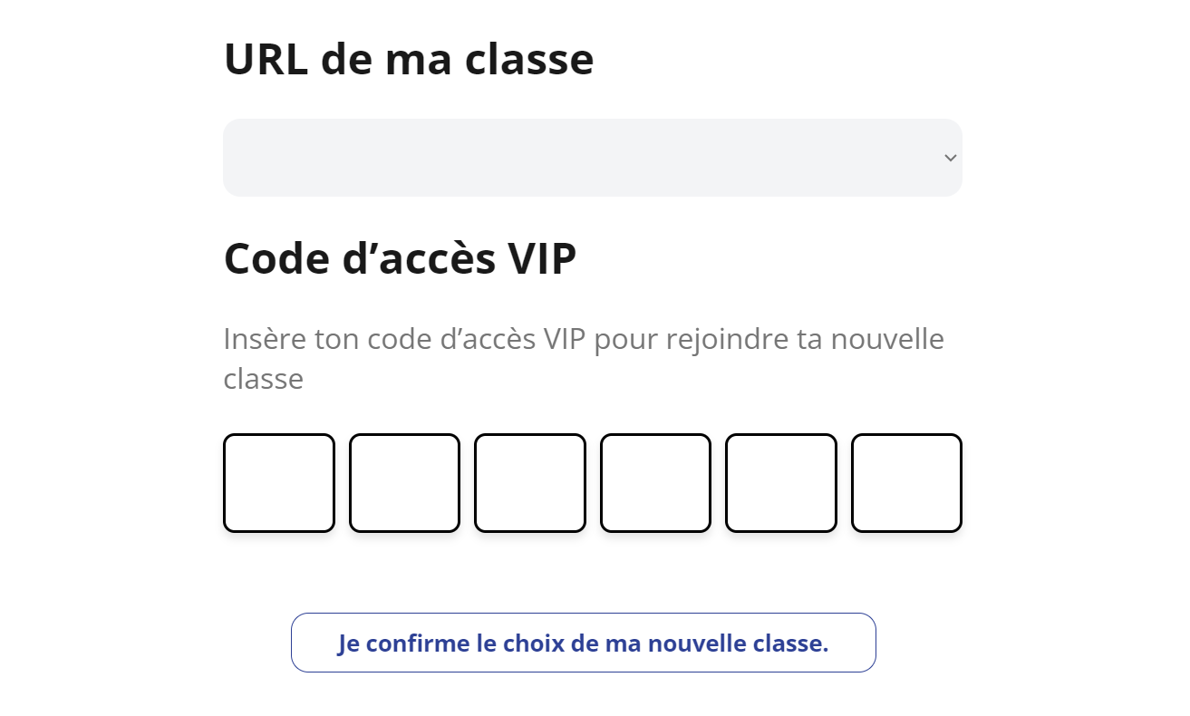 Les profils des élèves peuvent être simplement transférés d'une classe à une autre. Ainsi, il n'est pas nécessaire de renseigner deux fois le Visual lmplicit Profiler (VIP). Sur la page Internet https://www.enseignants.mission-future.com/fr/school/transfer-student/ les élèves retrouvent l'écran suivant. Ils leurs suffit de