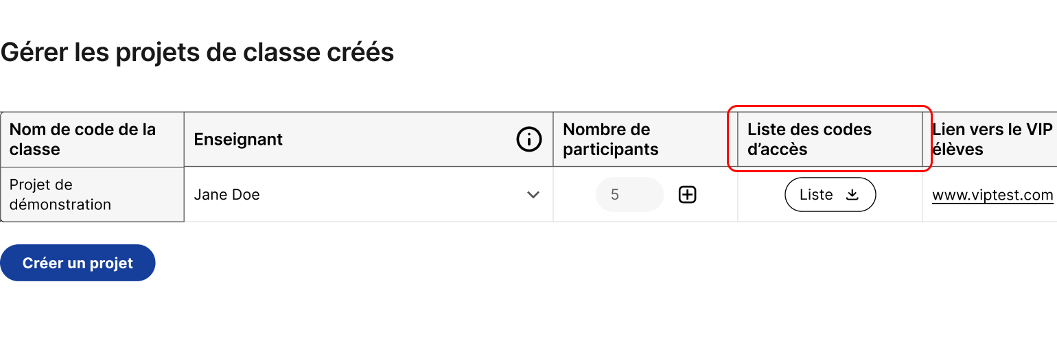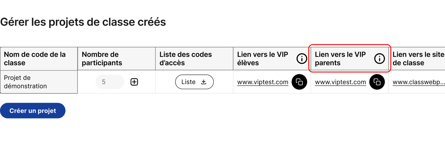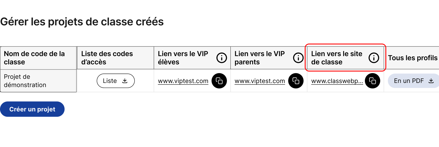 - Sous l'onglet Gérer les projets créés, allez à la colonne Lien vers le site de classe et cliquez sur le lien correspondant (également disponible sur la Liste des codes d'accès).